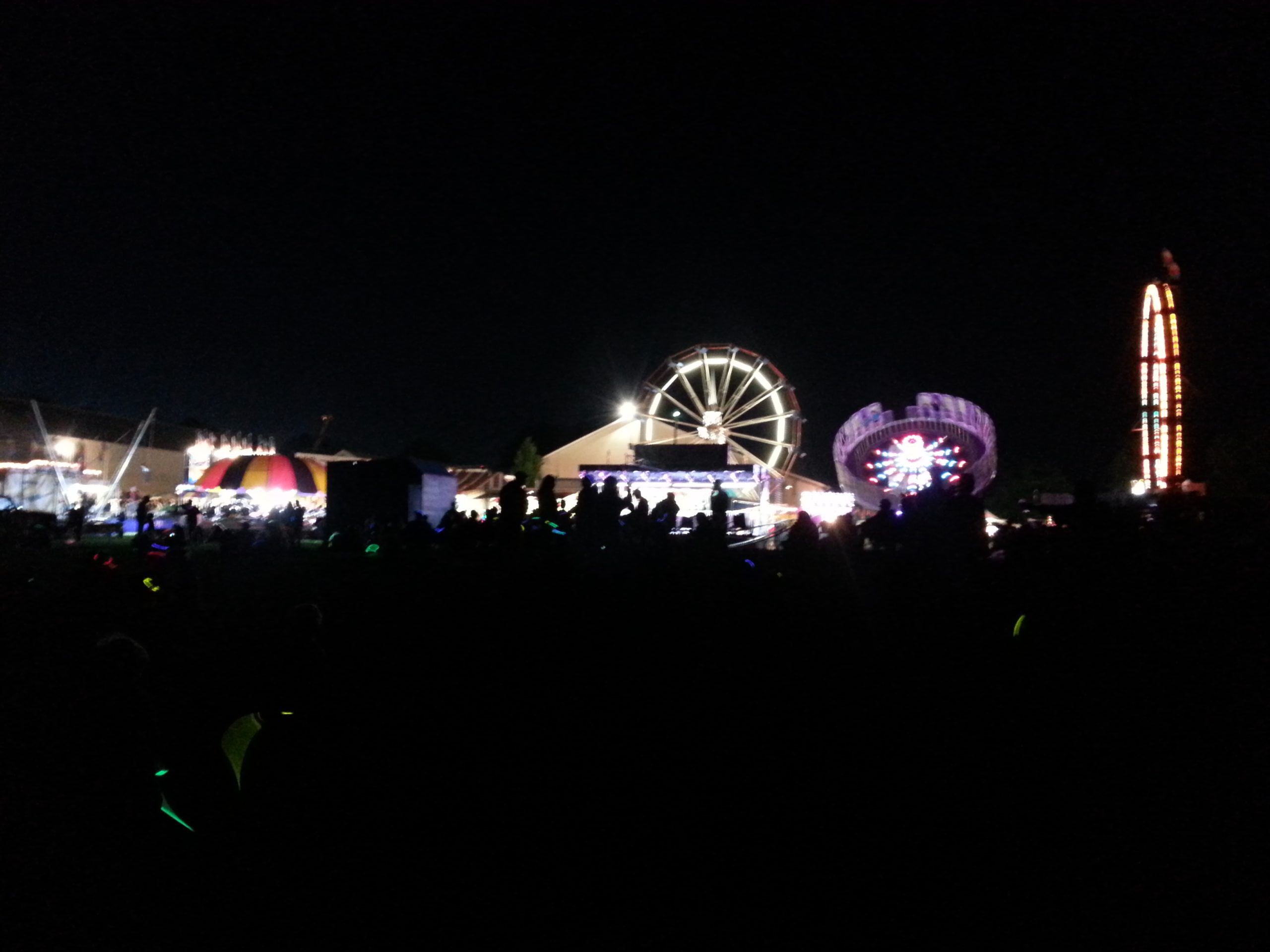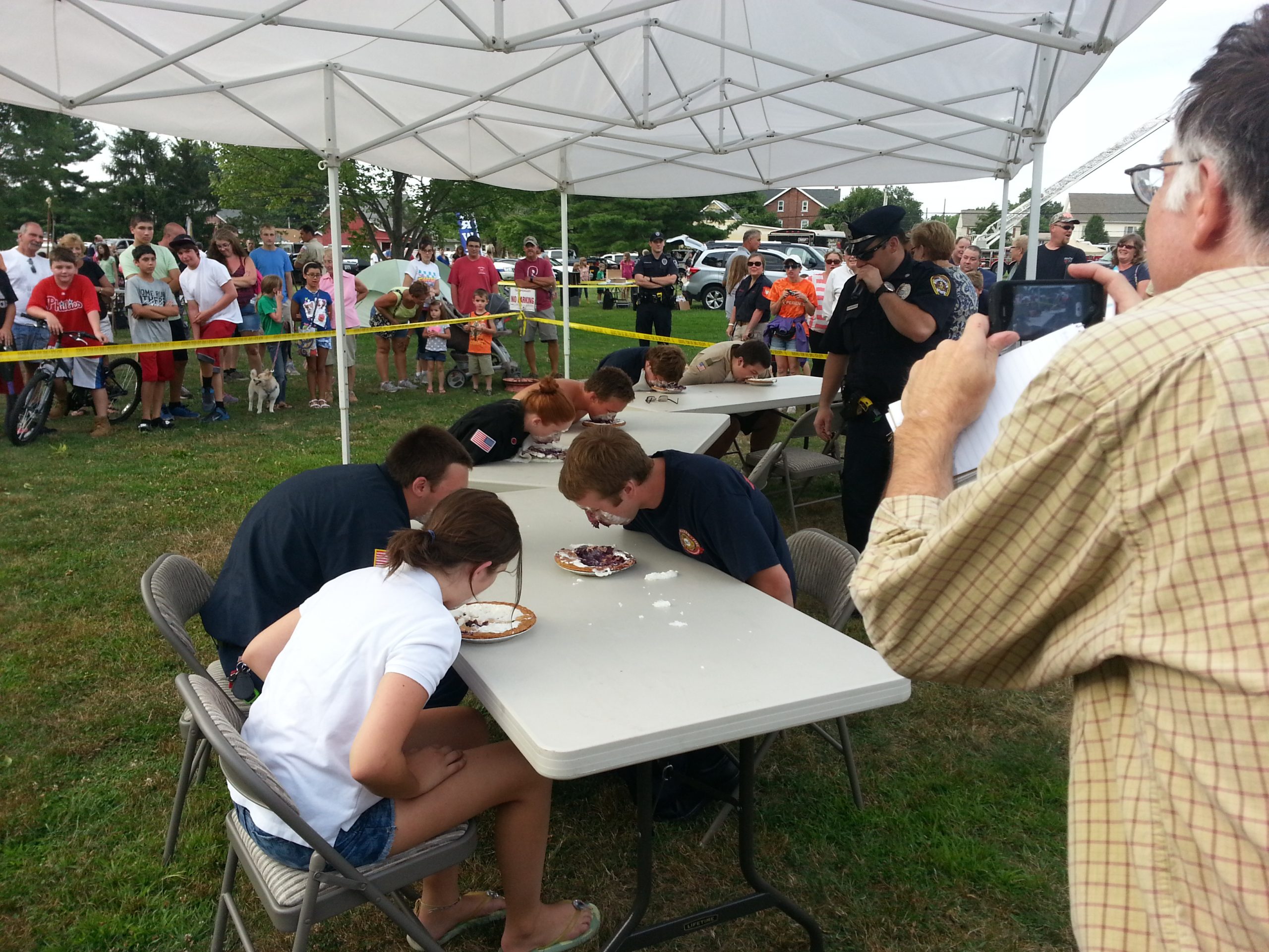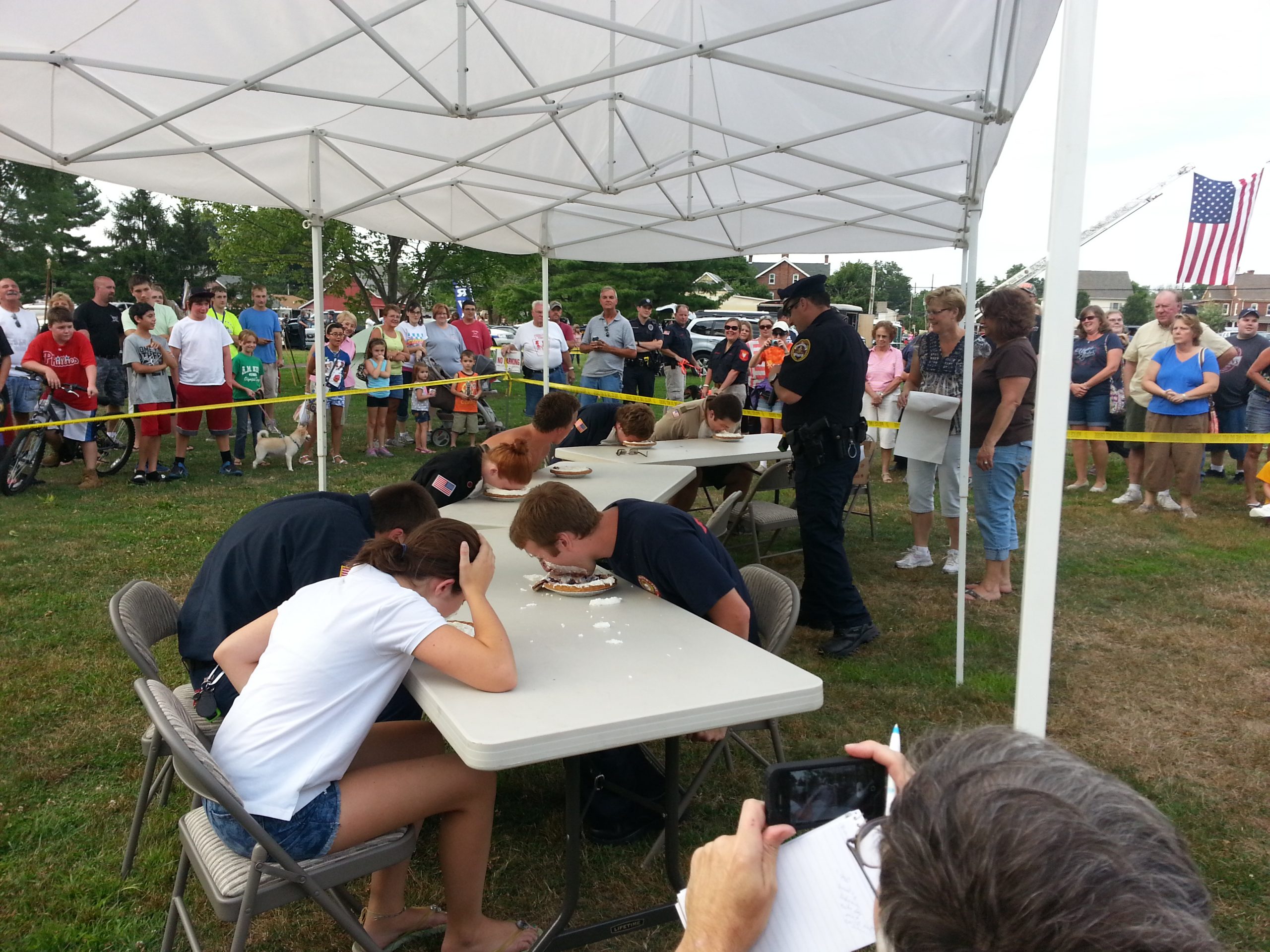 People participate in a pie-eating contest at outdoor tables under a white canopy, while a crowd watches and a person photographs the event. Yellow caution tape separates the audience from the contestants.